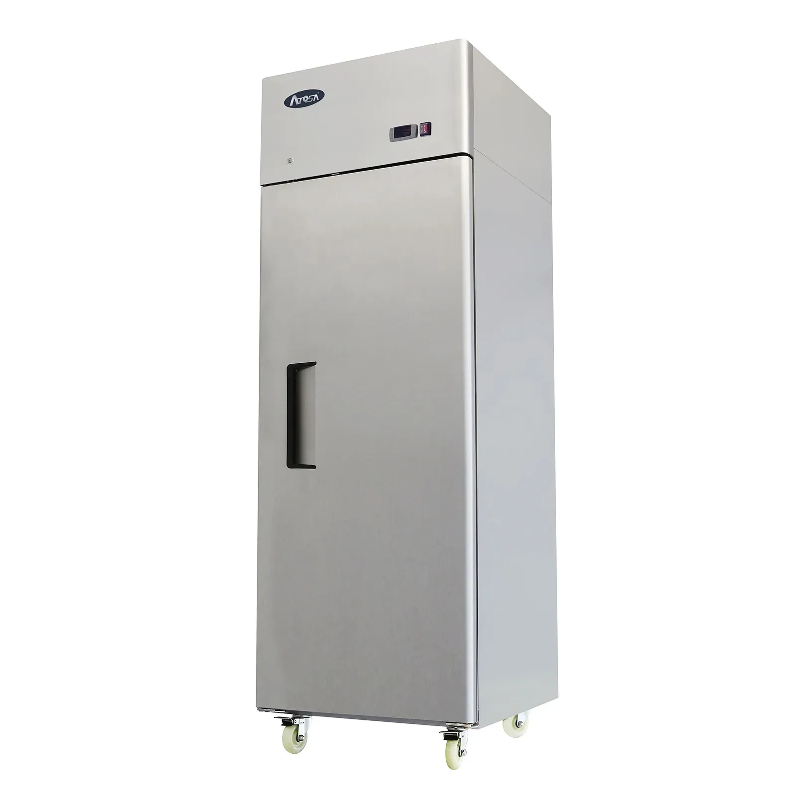 Streamline your restaurant cooking operations with the Atosa USA MBF8004GR Refrigerator, Reach-In. This top mount self-contained refrigeration unit is designed to optimize your kitchen space while providing efficient cooling for your ingredients. With a spacious 21.4 cu. ft. capacity and three adjustable shelves, you can easily organize and access your food items. The digital temperature control allows you to set the perfect temperature between 33° to 40°F, ensuring that your perishable goods stay fresh for longer. The locking hinged solid door provides added security, while the stainless steel interior and exterior make cleaning a breeze. The interior LED lighting illuminates the contents, making it easy to find what you need. With automatic evaporation and air defrost, maintenance is minimal. This ENERGY STAR® certified refrigerator also features 4" casters for easy mobility. Upgrade your restaurant kitchen with the Atosa USA MBF8004GR Refrigerator, Reach-In and experience enhanced efficiency and organization.