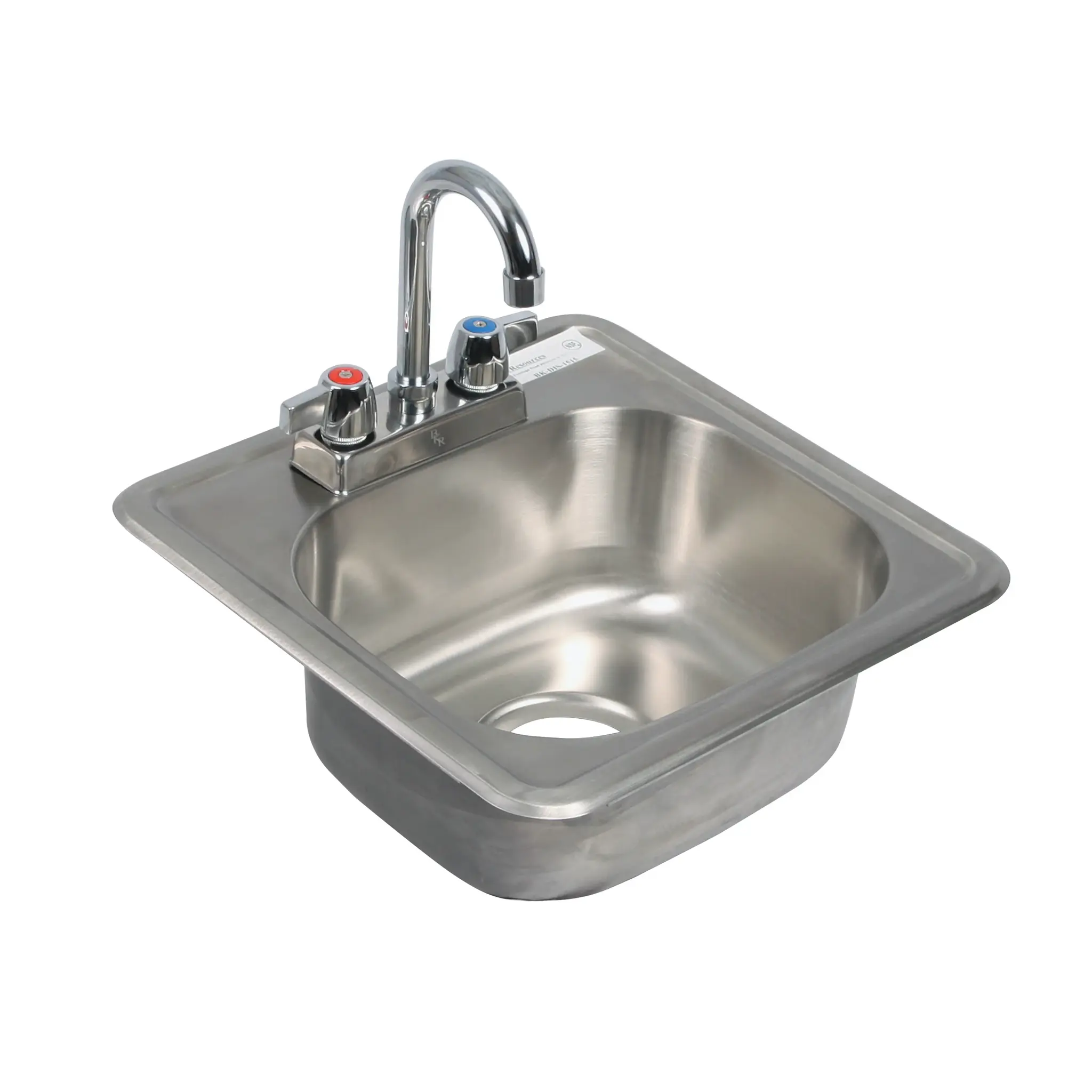 Elevate your cuisine with the BK Resources, BK-DIS-1515-P-G Drop-In Sink. This one-compartment sink is designed to meet the demands of a commercial restaurant kitchen. Made from 20/304 stainless steel, it offers durability and longevity, ensuring it can withstand the rigors of daily use. The sink features a 12" wide x 10" front-to-back x 5-3/4" deep compartment, providing ample space for washing and rinsing dishes. It also includes a deck mount faucet (BKD-3G-G) and a basket drain (BKDR-4) for added convenience. The 14-9/16" x 14-9/16" cutout with 1-1/2" RA at corners is required for installation. This drop-in sink is lead-free and NSF certified, guaranteeing its safety and compliance with industry standards. Trust BK Resources to deliver a high-quality sink that enhances the efficiency and functionality of your commercial kitchen.
