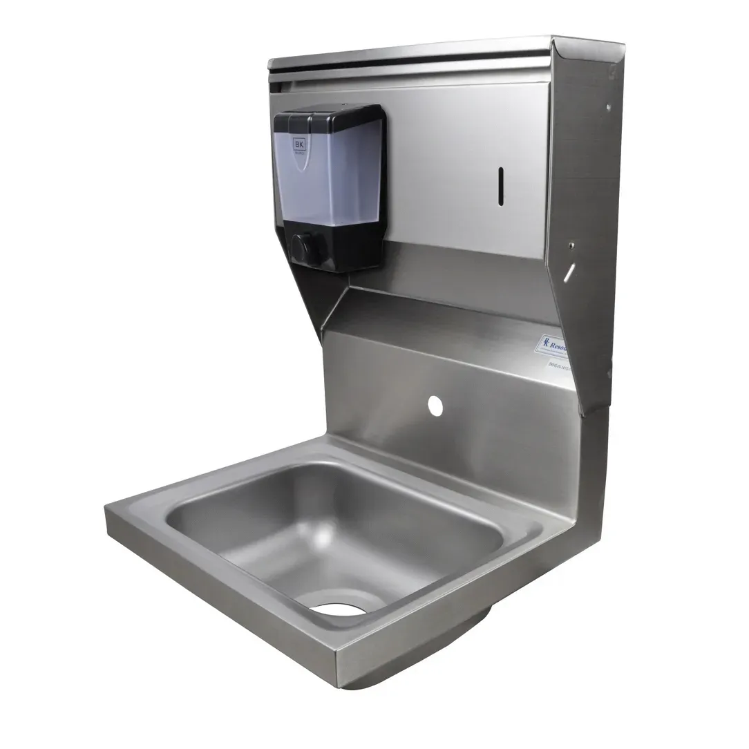 Experience kitchen innovation with the BK Resources BKHS-W-1410-1-4D-TD Hand Sink. This wall-mounted hand sink is designed to meet the needs of a busy commercial restaurant. With a 14" wide x 10" front-to-back x 5" deep bowl, it provides ample space for handwashing. The single splash mount faucet hole ensures easy access to water, while the marine edge prevents spills and splashes. The integral towel dispenser accommodates BK-MFPT "C" fold towels, and the soap dispenser (BK-SD) ensures proper hygiene. Made of 304 stainless steel, this hand sink is durable and easy to clean. It also includes wall mounting hardware for easy installation. With its NSF certification, you can trust that this hand sink meets the highest standards of sanitation. Upgrade your restaurant's handwashing station with the BK Resources BKHS-W-1410-1-4D-TD Hand Sink and ensure a clean and efficient kitchen environment.