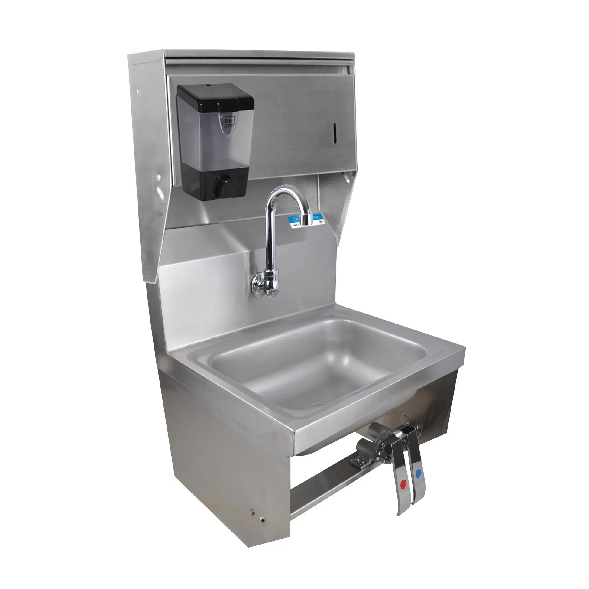 Mobilize your kitchen with the BK Resources BKHS-W-1410-1-4DTDPG Hand Sink. This wall-mounted hand sink is designed specifically for commercial restaurant use, making it an essential addition to any professional kitchen. The sink features a 14" wide x 10" front-to-back x 5" deep bowl, providing ample space for handwashing. It also includes a single splash mount faucet hole, ensuring easy access to water. The sink comes with a dual-pedal knee valve kit, allowing for hands-free operation and promoting hygiene. Additionally, it features an integral towel dispenser and soap dispenser, providing convenience for staff and customers. The 304 stainless steel construction ensures durability and easy cleaning, while the NSF certification guarantees its compliance with health and safety standards. Upgrade your restaurant's hygiene standards with the BK Resources BKHS-W-1410-1-4DTDPG Hand Sink.