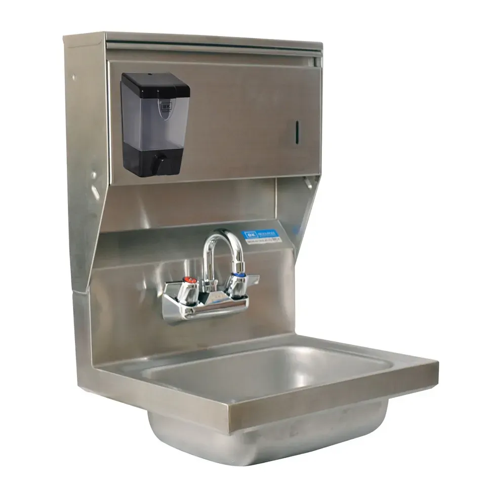 Optimize your kitchen efficiency with the BK Resources BKHS-W-1410-4D-TD-PG Hand Sink. This wall-mounted hand sink is designed specifically for commercial restaurant use, ensuring durability and functionality. The sink features a 14" wide x 10" front-to-back x 5" deep bowl, providing ample space for handwashing. The 4" OC splash-mounted design helps to prevent water splashing and keeps the surrounding area clean. The heavy-duty 3-1/2" mini gooseneck spout allows for easy water flow control, while the marine edge helps to contain any spills. The integral towel dispenser accommodates BK-MFPT "C" fold towels, providing convenience for hand drying. Made of 304 stainless steel, this hand sink is built to withstand the demands of a busy commercial kitchen. With its NSF certification, you can trust the quality and hygiene of this BK Resources hand sink. Upgrade your kitchen with this reliable and efficient hand sink.