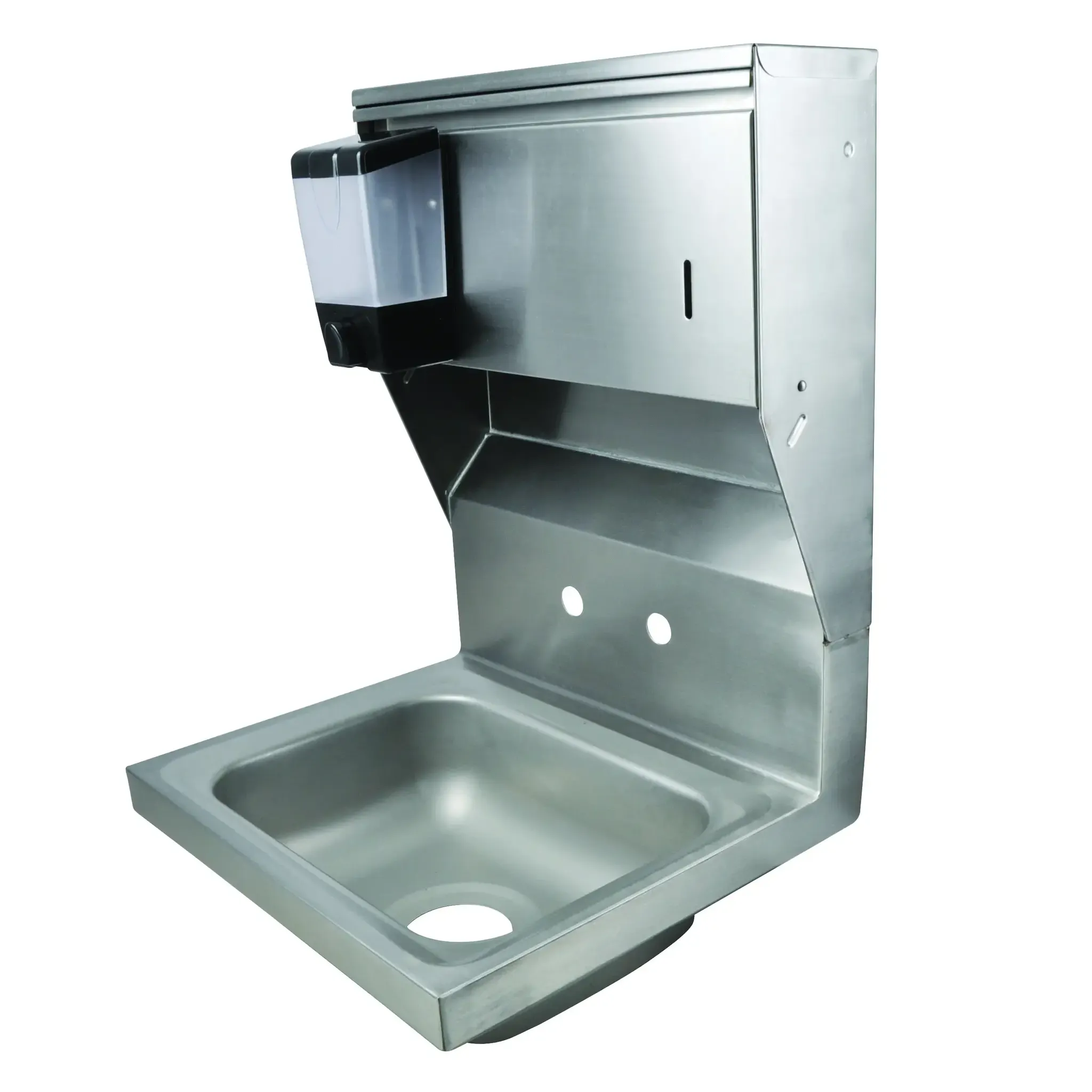 Discover kitchen perfection with the BK Resources BKHS-W-1410-4D-TD Hand Sink. This wall-mounted hand sink is designed to meet the needs of commercial restaurants, ensuring cleanliness and efficiency in the kitchen. The sink features a 14" wide x 10" front-to-back x 5" deep bowl, providing ample space for handwashing. With 4" OC splash mount faucet holes, you can easily install a faucet of your choice. The sink is made of durable 304 stainless steel construction, ensuring long-lasting performance in a busy restaurant environment. It also includes an integral towel dispenser that accommodates BK-MFPT "C" fold towels, promoting hygiene and convenience. The marine edge design prevents water from spilling over, keeping the surrounding area dry and safe. With its NSF certification, you can trust the quality and reliability of this BK Resources hand sink. Upgrade your restaurant's handwashing station with the BKHS-W-1410-4D-TD Hand Sink.