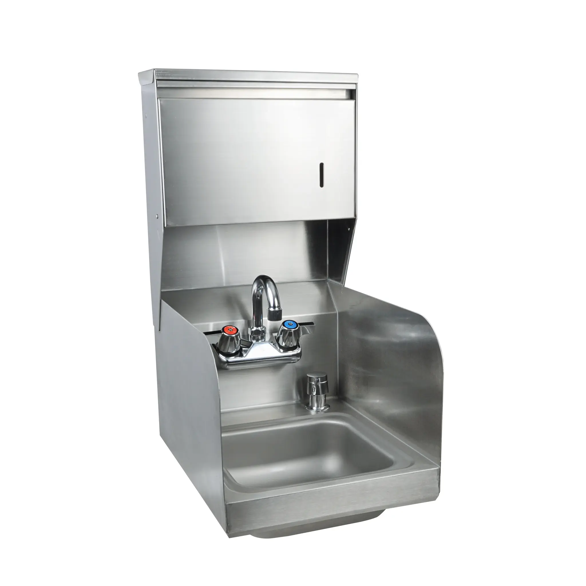 Culinary artistry redefined with the BK Resources BKHS-W-SS-SS-TD-P-G Hand Sink. This space-saving wall mount sink is designed to meet the needs of busy commercial restaurants. The 9" wide x 9" front-to-back x 5" deep bowl provides ample space for handwashing, while the 4" OC splash mount heavy-duty 3-1/2" mini gooseneck spout ensures efficient water flow. The sink features a marine edge and side splashes on the left and right, keeping water contained and preventing spills. It also includes a towel dispenser that accommodates BK-MFPT "C" fold towels, as well as a deck mount soap dispenser for added convenience. Made of durable 304 stainless steel, this sink is built to withstand the demands of a busy kitchen. NSF certified, it meets the highest standards of cleanliness and hygiene. Upgrade your restaurant's handwashing station with the BK Resources BKHS-W-SS-SS-TD-P-G Hand Sink.
