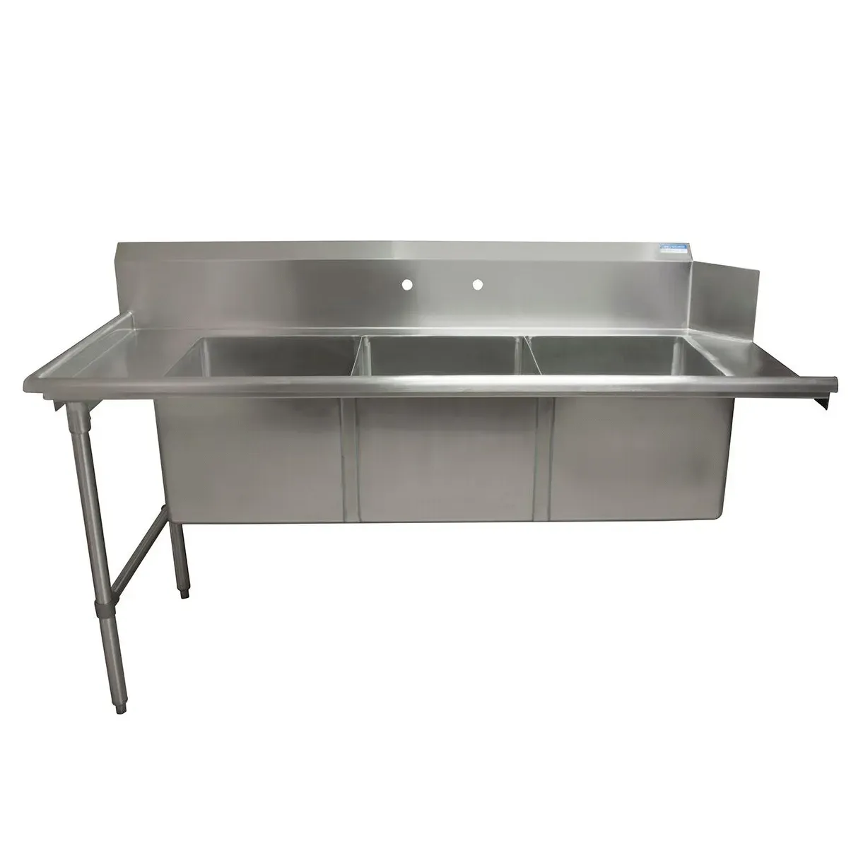 Unleash your inner chef with the BK Resources BKSDT-3-1820-14-LSPG Dishtable with Potsinks. This commercial-grade dishtable and three-compartment sink is designed to meet the demands of a busy restaurant kitchen. With its spacious 72"W x 30-3/8"D x 44"H overall size, left-to-right operation, and three 18" wide x 20" front-to-back x 14" deep compartments, you'll have plenty of room to tackle even the largest of dishes. The 10"H backsplash helps keep your walls clean and protected, while the included pre-rinse assembly, lever drains, basket drains, tray guides, and pre-rinse basket make dishwashing a breeze. Made from durable 18/304 stainless steel with rolled edges and stainless steel legs and side bracing, this dishtable is built to withstand the rigors of a commercial kitchen. Adjustable stainless steel over plastic bullet feet ensure stability on any surface. NSF certified for food safety, this BK Resources dishtable is a must-have for any restaurant looking to streamline their dishwashing process.