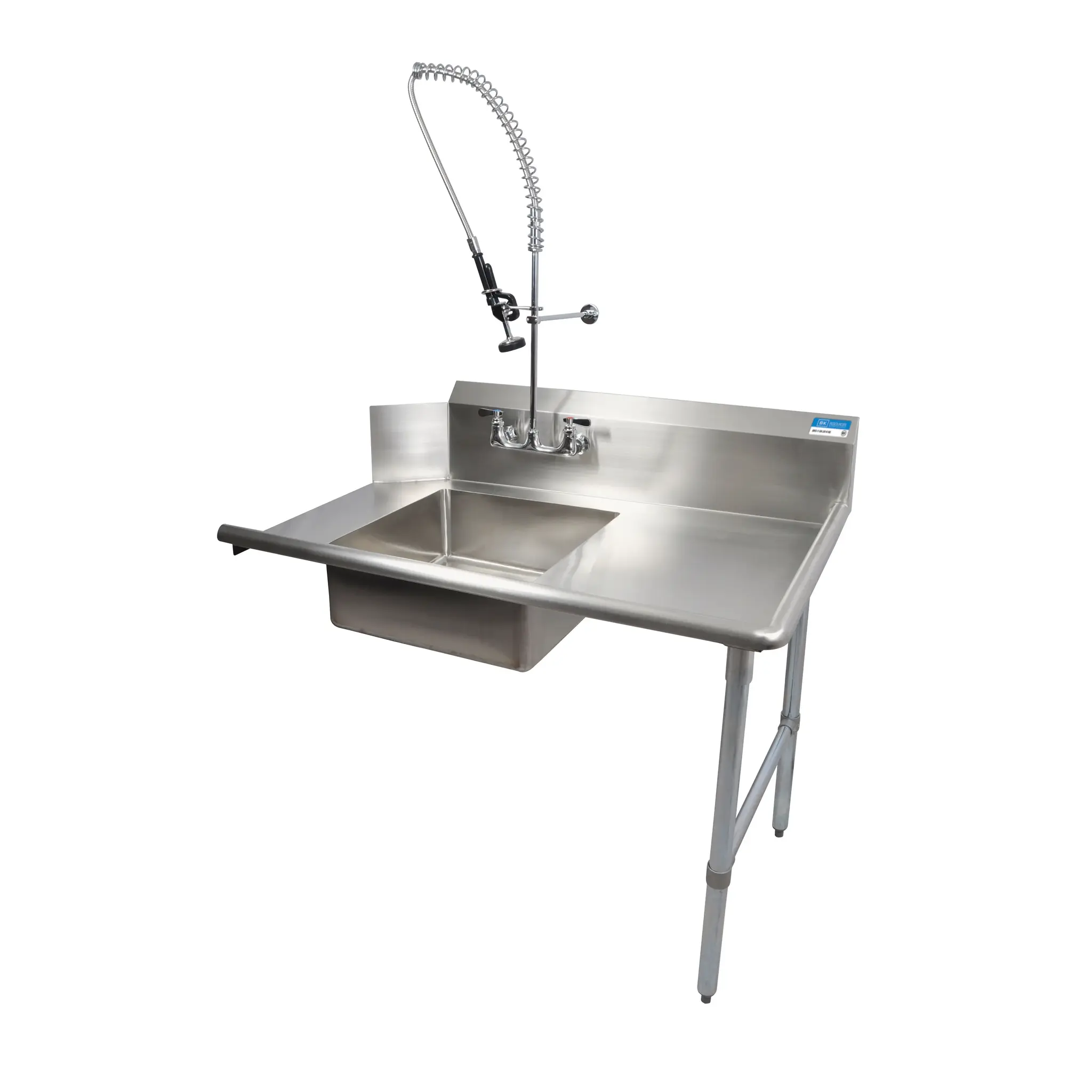 Deliver food perfection with the BK Resources BKSDT-60-R-SS-P-G Soiled Dishtable. This straight design dishtable is specifically designed for commercial restaurant use, ensuring efficiency and convenience in your kitchen. Made with high-quality 18/304 stainless steel, this dishtable is built to withstand the demands of a busy restaurant environment. The 60"W x 30-3/8"D x 46-1/4"H size provides ample space for your dishwashing needs. The right-to-left operation allows for seamless workflow, while the 20" x 20" x 8" deep pre-rinse sink and 8" OC splash mount pre-rinse faucet make cleaning a breeze. The raised rolled edges on the front and sides prevent spills and splashes, keeping your kitchen clean and safe. With stainless steel legs and side bracing, as well as adjustable bullet feet, this dishtable is sturdy and stable. NSF certified, this BK Resources dishtable is a reliable and essential addition to any commercial restaurant kitchen.