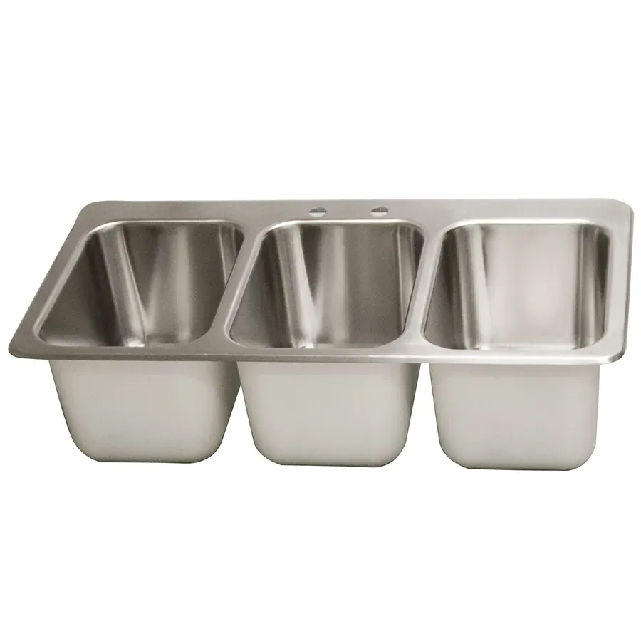 Mobilize your kitchen with the BK Resources, DDI3-10141024, Drop-In Sink. This three-compartment sink is designed to meet the demands of a busy commercial restaurant. With an overall size of 35-3/4"W x 18-1/2"D x 10"H, it provides ample space for washing, rinsing, and sanitizing dishes. The three 10" wide x 14" front-to-back x 10" deep compartments allow for efficient workflow and can accommodate large pots and pans. The set of 4" OC deck mount faucet holes ensures easy installation of your preferred faucet. Made of 18/304 stainless steel, this sink is durable and resistant to corrosion, making it perfect for a high-volume kitchen. It also includes three basket drains (BKDR-4) for added convenience. NSF certified, this drop-in sink meets the highest standards of sanitation and hygiene. Upgrade your kitchen with the BK Resources, DDI3-10141024, Drop-In Sink and experience enhanced efficiency and cleanliness.