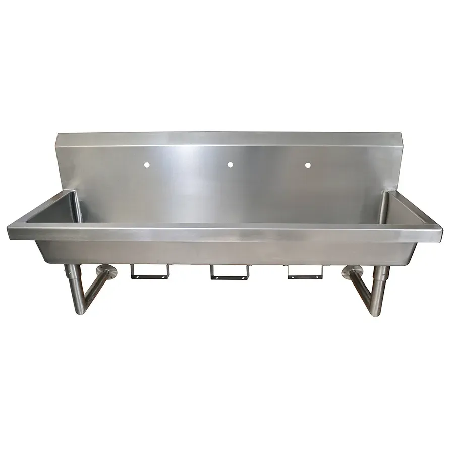 Fuel your restaurant's success with the BK Resources MSHS-72W1B Handwash Sink. This three-station sink is perfect for busy commercial kitchens, providing convenience and efficiency. The wall-mounted design saves valuable floor space, while the three single-hole splash mount faucet holes allow for easy installation of faucets. The 72-inch width and 19-7/8-inch front-to-back dimension provide ample space for multiple users to wash their hands simultaneously. The 8-inch deep bowl ensures that water stays contained, reducing mess and splashing. Made from durable 14/304 stainless steel, this sink is built to withstand the demands of a busy restaurant environment. The knee valve bracket allows for hands-free operation, promoting hygiene and preventing cross-contamination. With its NSF certification, you can trust that this sink meets the highest standards of cleanliness and sanitation. Upgrade your restaurant's handwashing station with the BK Resources MSHS-72W1B Handwash Sink and ensure the health and safety of your staff and customers.