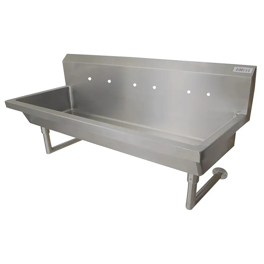 Boost your restaurant's performance with the BK Resources MSHS-72W2 Handwash Sink. This three-station sink is perfect for busy commercial kitchens, providing convenience and efficiency. The sink is wall-mounted and features three sets of 8" OC splash mount faucet holes, allowing multiple staff members to wash their hands simultaneously. With a spacious 72" width and an 8" deep bowl, there is plenty of room for thorough handwashing. The sink is made of durable 14/304 stainless steel, ensuring long-lasting performance in a demanding restaurant environment. It also comes with an easy-to-use basket drain for quick and efficient water drainage. The 18 gauge stainless steel legs and supports provide stability and durability. NSF certified, this handwash sink meets the highest standards of cleanliness and sanitation. Upgrade your restaurant's hygiene standards with the BK Resources MSHS-72W2 Handwash Sink.