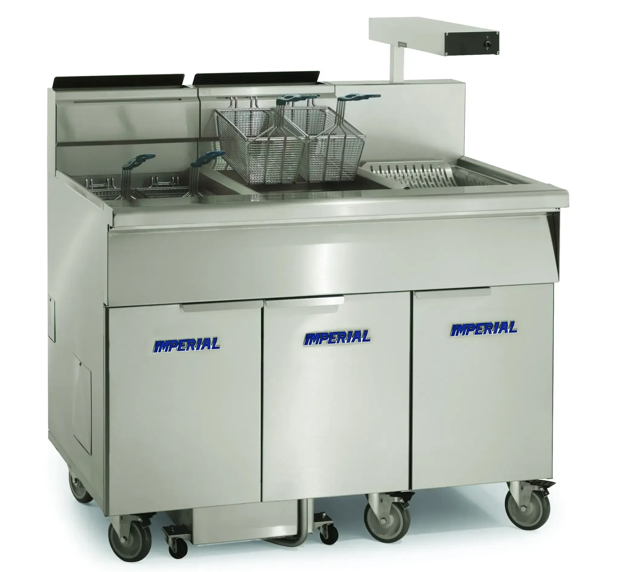 Cook with confidence using the Imperial, IFSCB150C Fryer, Gas, Floor Model, Full Pot. This high-quality fryer is designed for commercial restaurant use, offering a 50lb. capacity and a built-in filter system for easy maintenance. With a 5.5 GPM roller pump and computer controls, you can ensure precise cooking results every time. The fryer also includes a convenient drain station, cabinet, food warmer, dump pan, joiner strips, and a filter start kit, providing everything you need for efficient frying operations. Made with durable stainless steel construction on the frypot, front, sides, landing ledge, and cabinet, this fryer is built to withstand the demands of a busy kitchen. The casters allow for easy mobility, while the 140000 BTU gas burner ensures quick and efficient cooking. With CSA Flame, CSA Star, NSF, and CE certifications, you can trust the safety and reliability of this Imperial fryer. Upgrade your restaurant kitchen with the Imperial, IFSCB150C Fryer, Gas, Floor Model, Full Pot and experience superior frying performance.
