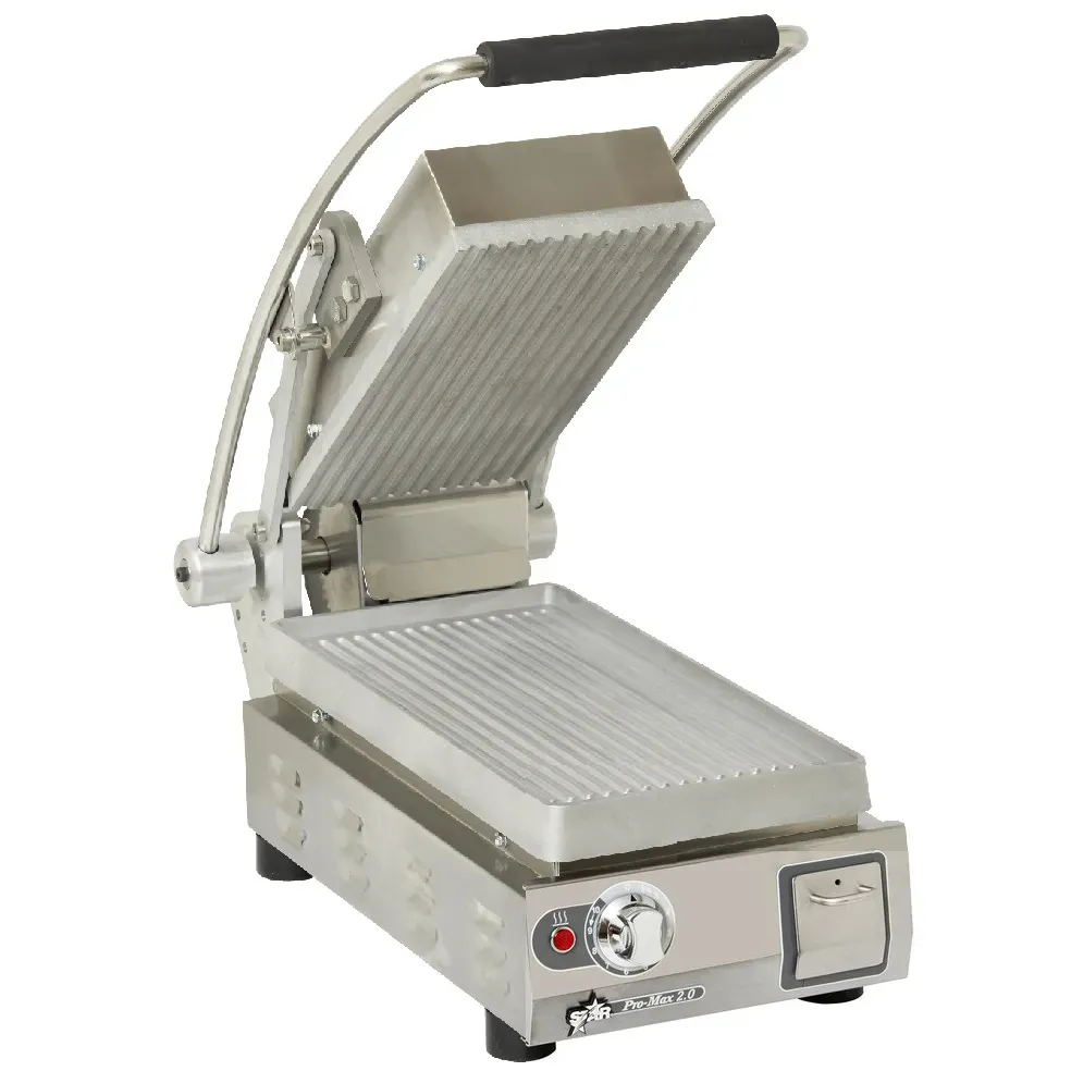 Elevate your dining experience with the Star PGT7A Sandwich/Panini Grill. This high-performance grill is designed to meet the demands of a commercial restaurant setting. With its 7.5" W x 14.2"D grooved aluminum cooking surface, you can achieve perfect grill marks on your sandwiches and paninis every time. The performance torsion spring hinge with an ergonomic curved handle ensures easy operation and consistent results. The analog 175-550F thermostat control allows for precise temperature adjustments, giving you full control over the cooking process. The low profile design and stainless steel exterior make this grill both durable and easy to clean. The removable grease drawer helps maintain a clean and safe cooking environment. With its non-skid feet, cULus and UL EPH Classified certifications, and Made in USA quality, the Star PGT7A Sandwich/Panini Grill is the perfect addition to any commercial kitchen.