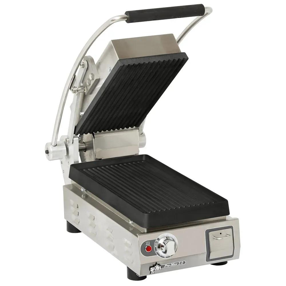Introducing the Star PGT7IA Sandwich / Panini Grill, the perfect addition to any commercial restaurant kitchen. Designed to deliver food perfection, this Pro-Max 2.0 Sandwich Grill is a game-changer. With a 7.5" W x 14.2"D grooved cast iron cooking surface, it ensures even heat distribution and creates those coveted grill marks on your sandwiches and paninis. The performance torsion spring hinge with an ergonomic curved handle allows for easy operation and consistent pressure, resulting in perfectly toasted sandwiches every time. The analog 175-550F thermostat control gives you precise temperature control, while the low profile design and removable grease drawer make cleaning a breeze. Made in the USA with a stainless steel exterior and non-skid feet, this sandwich grill is built to last. Trust Star, a reputable vendor in the industry, and elevate your restaurant's sandwich game with the PGT7IA Sandwich / Panini Grill.